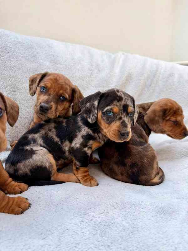 Jezevčík hladkosrstý trpasličí- nabízíme krásná cistokrevná štenátka po kvalitních a zdravých rodicích, milé povahy, všechny štenátka jsou kompletne ockovaní, naucené na hygienu, mají celodenní starostlivost.