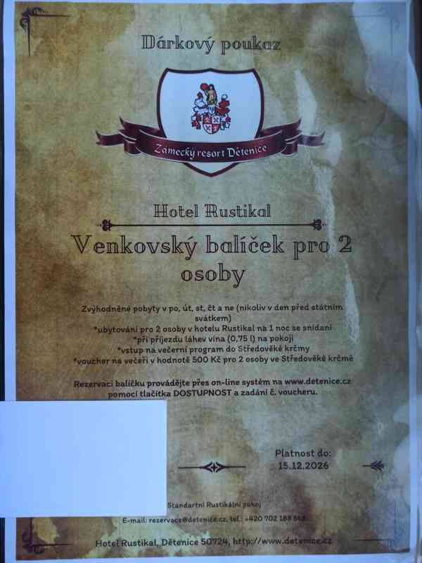 Prodám dárkový poukaz pro 2 osoby - Zámecký resort Dětenice.