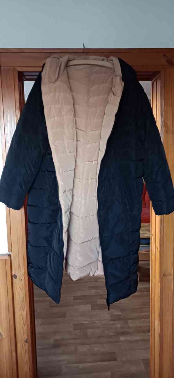 Prodám nenošený dámský zimní oboustranný kabát se zipy na stranách. Velikost 50 na výšku cca 1,75.