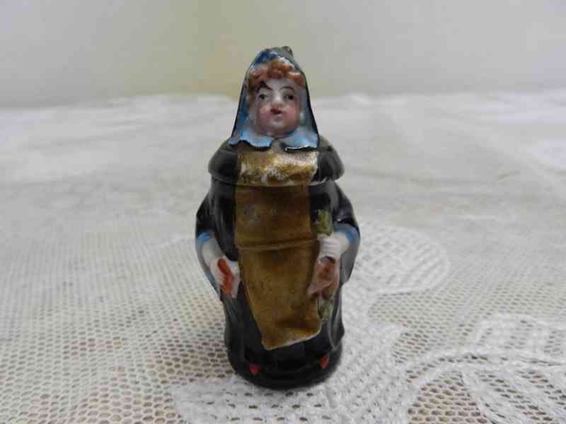 Vzácný velmi starý porcelánový mini korbel s mnichem.
