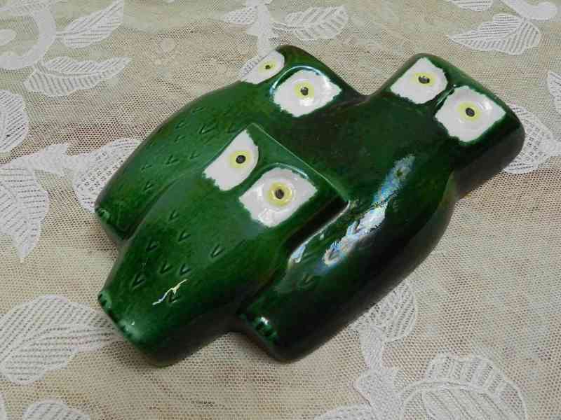 Keramický reliéf na zeď, Sovy, glazovaná keramika, plastický dekor, barva zelená - Keramia Znojmo Czechoslovakia.