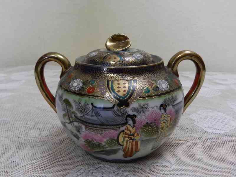 Luxusní porcelánová Cukřenka s Gejšami, velmi kvalitní zpracování porcelánu, bohaté zdobení a zlacení - Japonsko, Satsuma, období Meidži, značeno, 19/20 stol.