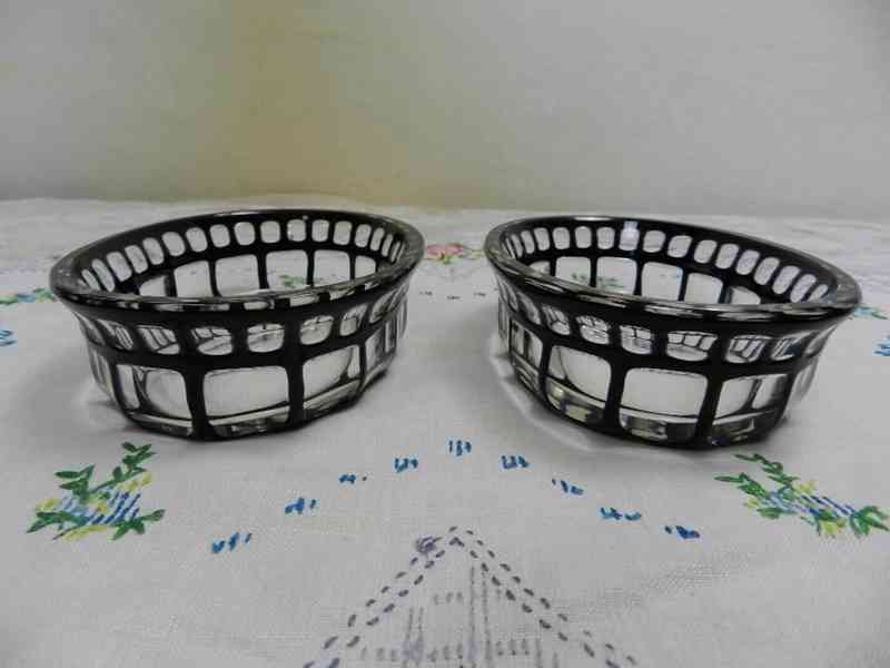 2 krásné oválné misky, číré sklo přejímané fialovým, probrušované čtvercové fazety - Otto Prutscher, Meyr's Neffe, Adolfov, kolem 1910.