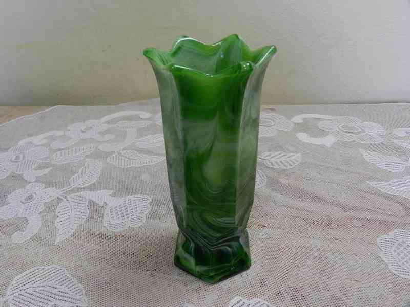 Krásná Art Deco zelená šestiboká Váza z opakního skla v barvě zeleného onyxu, Carl Stolzle a Sohne, heřmanova Huť, 1 třetina 20 stol.