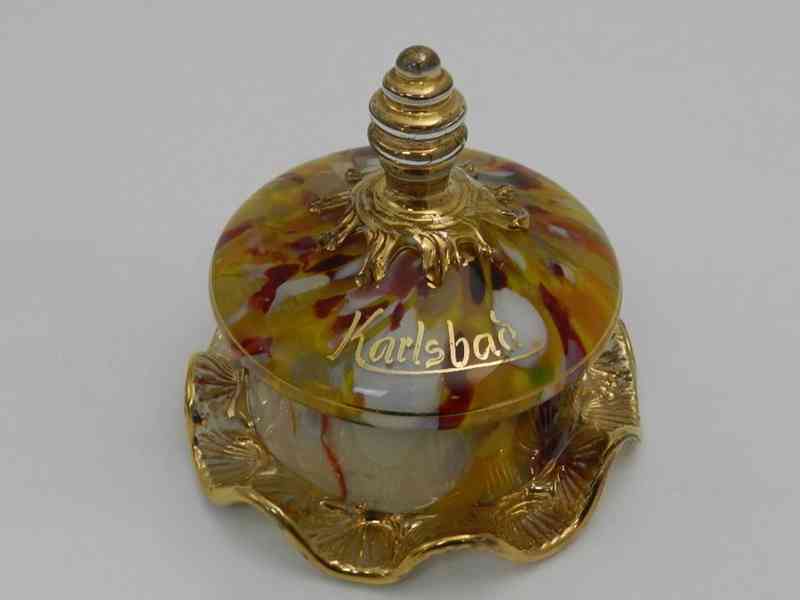 Luxusní barevná silně zlacená Dóza - Glaspalast Karlsbad, značeno na spodní straně, Hermann Holzner, založení 1854, obchod skleněným zbožím a manufaktura skleněného zboží, 1 čtvrtina 20 stol.