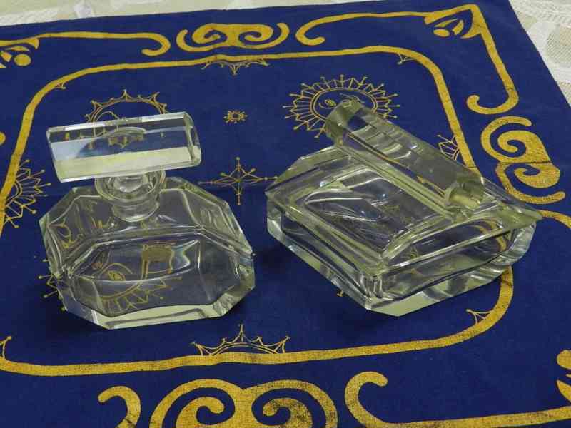 Luxusní Flakon a Dóza, jedná se o silnostěnné broušené čiré sklo, značeno na originálním štítku Sudetenland, možná výroba Moser.