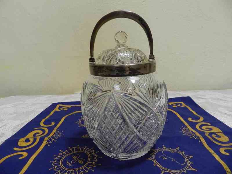 Krásná bohatě broušená masivní Dóza z čirého skla, stříbrná montáž, Čechy, 1 třetina 20 stol.