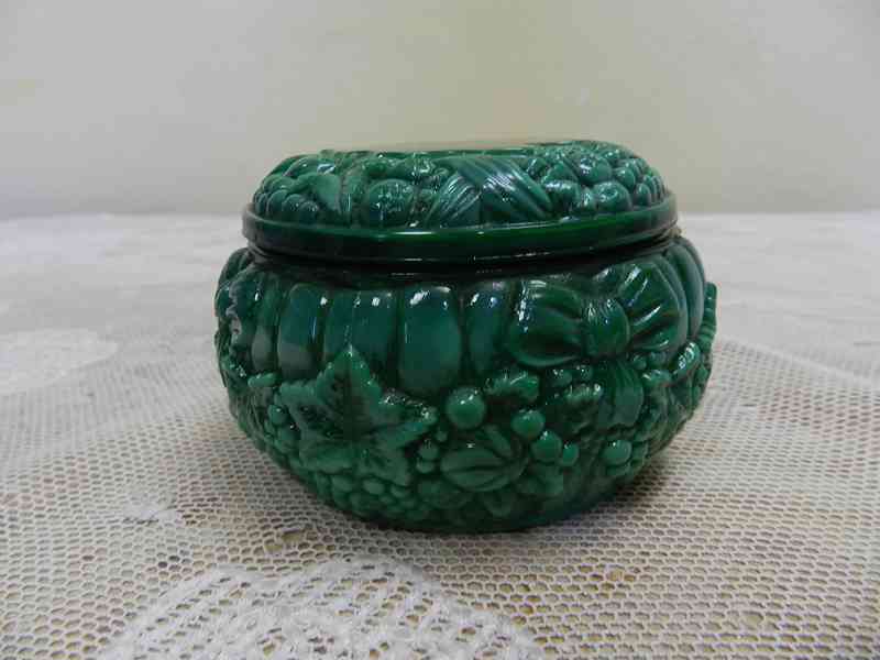 Hezká kulatá Dóza, plastický reliéf, malachitové sklo, kolem 1 pol. 20 stol.