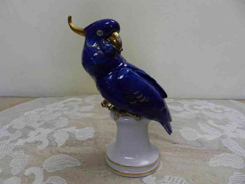 Krásný zlacený ručně malovaný Papoušek větších rozměrů, modrá barva - Volkstedt, Karl Ens, Německo, kolem 1930.