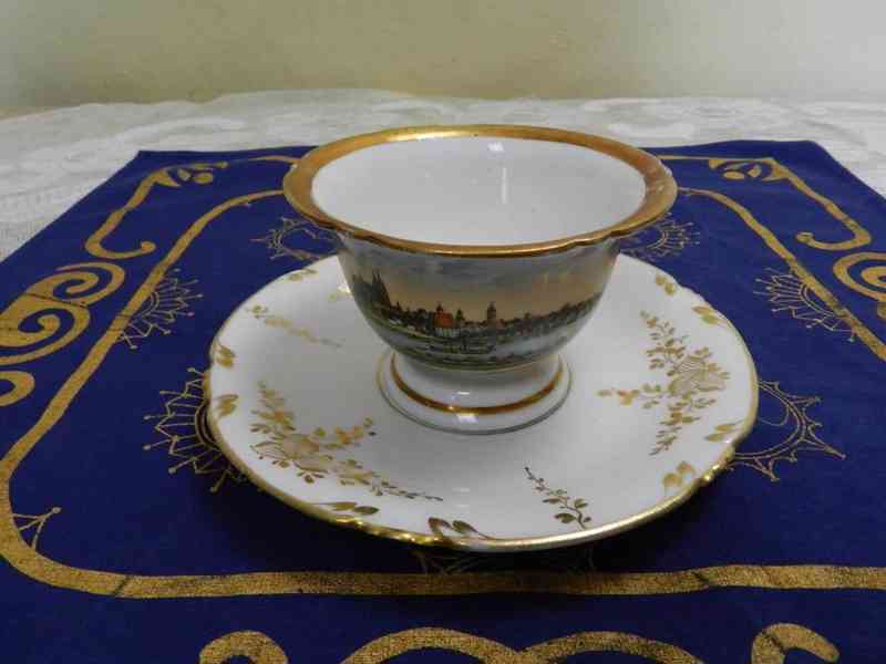 Krásný ručně malovaný zlacený Hrnek s podšálkem, veduta, 19 stol.