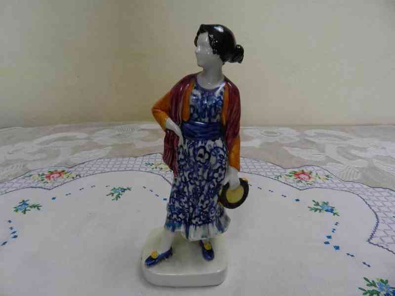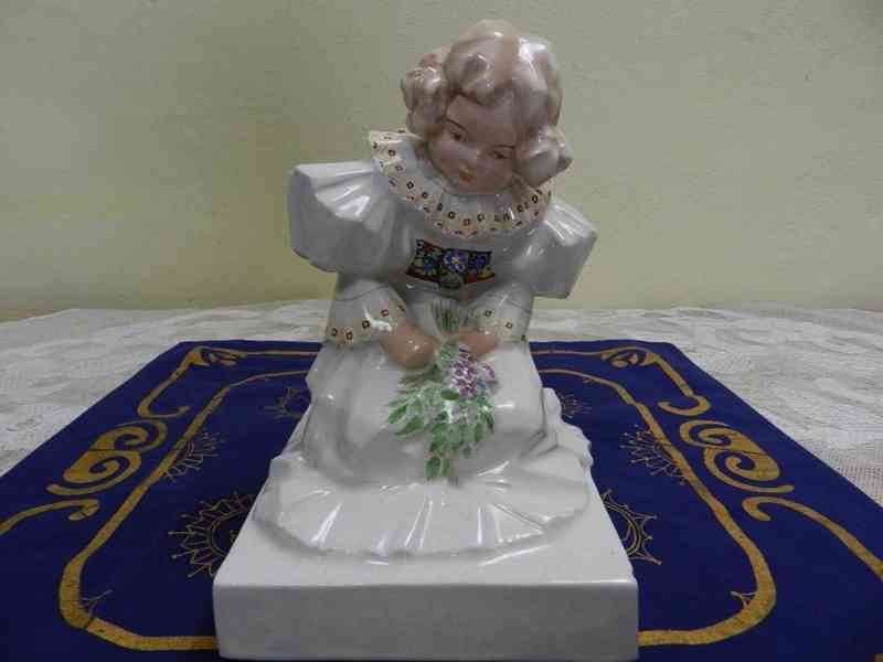 Hezká ručně malovaná keramická Soška, Dívka s Květinami - Bechyně, 1 pol. 20 stol.