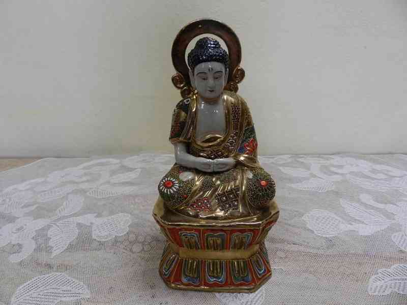 Luxusní bohatě ručně zdobená a zlacená porcelánová soška Budhy, kvalitní zpracování - Satsuma, Japonsko, 19/20 stol.