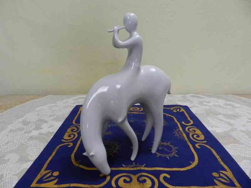 Větší bílá porceánová Soška Chlapec s Píšťalou, styl Brusel - Royal Dux, Jaroslav Ježek, kolem 60 let 20 stol.