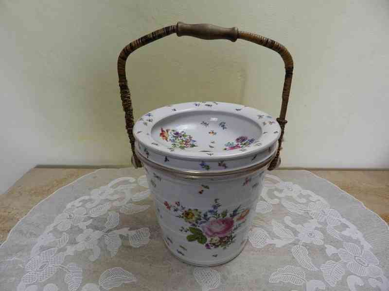 Nevídaný silnostěnný Kbelík s nálevkou, bohatá pestrobarevná ruční malba po celém obvodu, motivy květin a hmyzu, zlaceno - Značeno čísly a písmenem I, 19 stol.