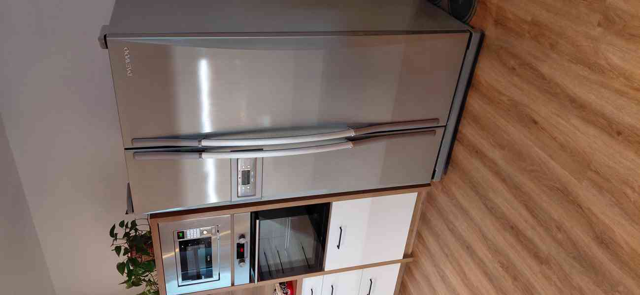 Minimálně používaná, volně stojící s mechanickým ovládáním, zaoblený tvar, 2 skleněné přihrádky a 3 přihrádky ve dveřích, výškově nastavitelné nožky, tichá.