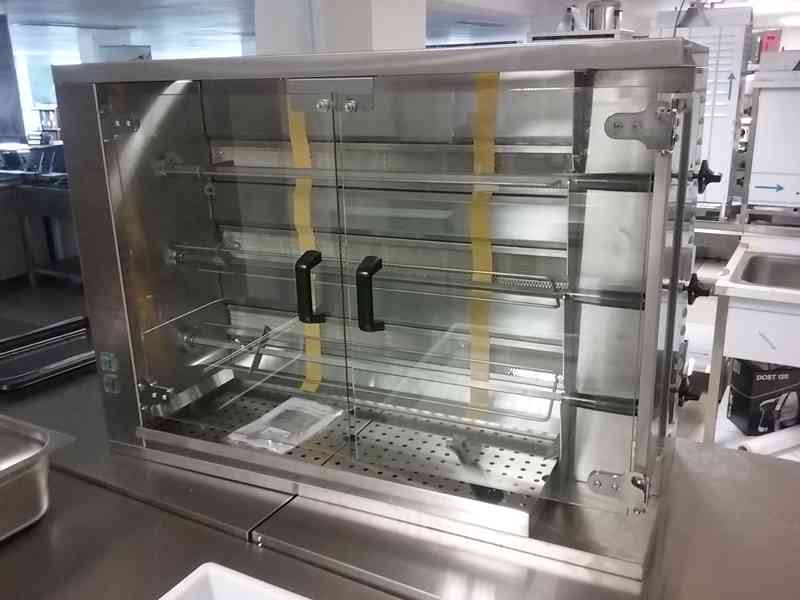 Profesionální gril na 15 kuřat, plynová (možno i elektrická) verze. Nerezový gril na 3 rožně s kapacitou 12 - 15 kuřat; rozměr ŠxHxV: 1150 x 472 x 793 mm, výkon 14 kW, trysky zemní plyn nebo PB, otáčení roštů elektrické, spodní miska, skleněné dveře otvírací. Další grily elektrické na 2 – 6 rožňů s kapacitou 8 – 30 kuřat na vyžádání. Naše cena: 51.990,- Kč vč. DPH + doprava. (kód: K975103)