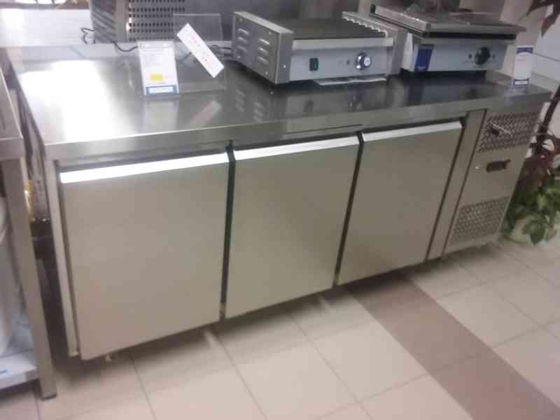 Trojdvéřový chladící stůl z řady EKO o obsahu 417 litrů. Rozměr ŠxHxV: 1795 x 700 x 850 mm; výkon 0,235 kW / 230 V; teplota 2°C až +8°C; cirkulační chlazení. Kompletní provedení z nerezu; digitální ovládání, odmrazování; automatické zavírání, magnetické těsnění dveří; 3 x rošt rozměr 1/1 GN; vhodné do okolní teploty 38°C / 60% vlhkosti. Cena: 39 990,- Kč vč. DPH + doprava. (kód: F841036)
