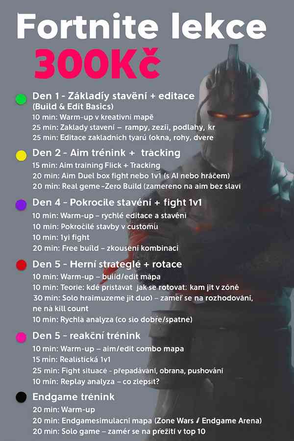 7 dní každý den 1 hodina , cena 300CZK naučím tě hlavně střílet , postupně stavění během aimu