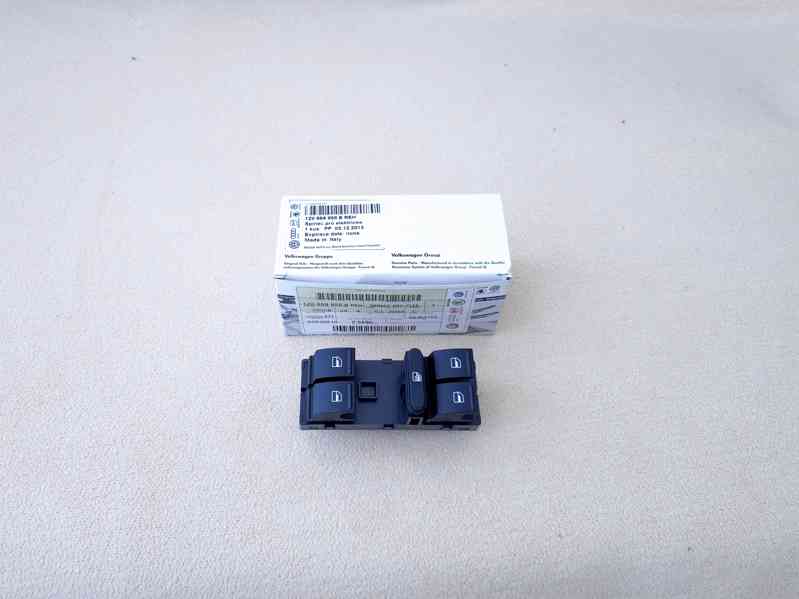 Nový originál Škoda Auto a.s. spínač ovládání předních a zadních oken se zeleným podsvícením - verze pro 4 elektricky stahovaná okna a blokace stahování zadních oken.