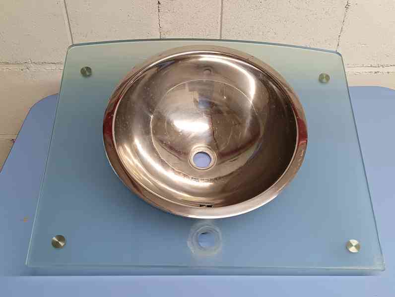 Prosím viz foto... zespodu matové tvrzené sklo se zabroušenými hranami, plechové umyvadlo. K dispozici jsou případně celkem 3 kusy, cena je uvedena za jeden komplet. Rozměr skla je : šířka 65cm, hloubka 55cm, otvor pro připojení 35mm. Síla skla je 15mm. Průměr umyvadla je 44cm.