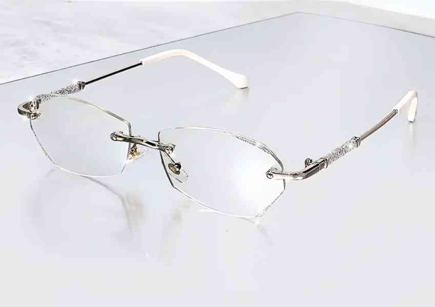 Elegantní bezobroučkové brýle s lesklým kovovým třpytem a hranatým rámem.
