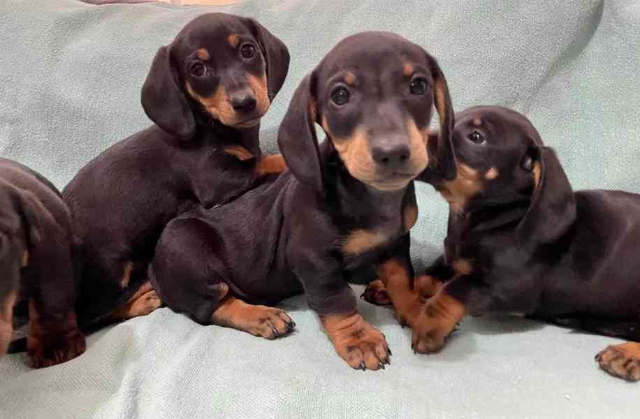 Prodám štěňata hladkosrstého trpasličích jezevčíků pouze psi, černí s pálením. Čistokrevná bez PP. Možno vidět oba rodiče. Čipovaná, očkovaná, odčervená. K odberu od 30.04.