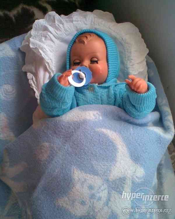 celuloidní panenka mrkací, flirtující oči, plačící, v kojeneckém oblečení, zavinovačce, dece, má dudlík na řetízku, botičky, chrastítka, pískací žirafu, hrající srdíčko, vhodná do retro kočárku, za odkoupení daruji fusak