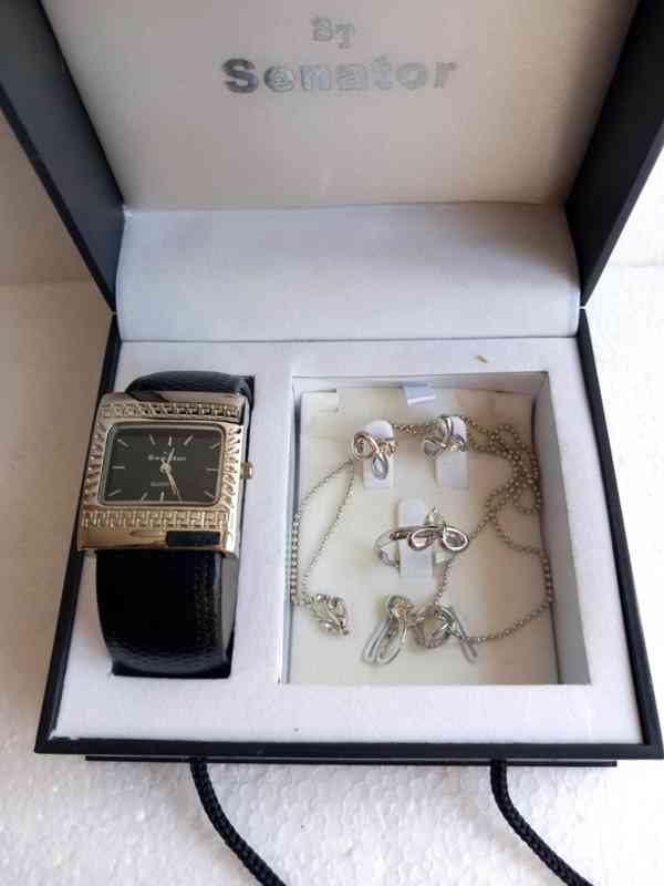 Prodám kazetu Senator s dámskými hodinkami Quartz, náušnicemi, prstýnkem a řetízkem s přívěskem z bílého kovu. Všechno nové, nepoužité, funkční.