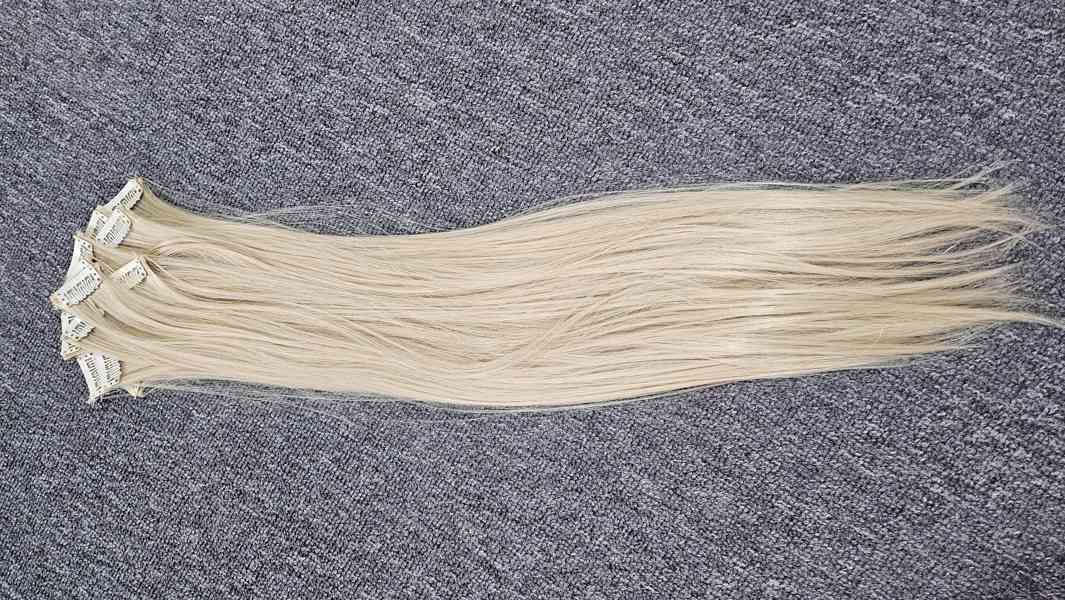 Krasny clip in vlasy k prodlouzeni.Platinova blond,60 cm dlouhe. Vlasy synteticke,bez lesku,vypadaji jako prave.