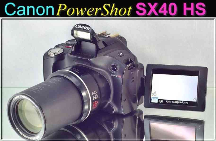 Digitální fotoaparát Canon PowerShot SX40 HS má 35× ultraširokoúhlý optický zoom s motorem USM. Systém HS System (12,1 megapixelu) s procesorem DIGIC 5. Displej LCD s variabilním úhlem natočení a úhlopříčkou 6,8 cm (2,7"), elektronický hledáček. Image Stabilizer (s rozsahem 4,5 EV) Inteligentní IS. Filmy v rozlišení Full HD (1080p) rychlostí 24 snímků/s se stereofonním zvukem.