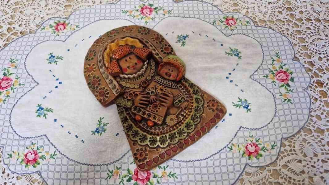 Zajímavý starý reliéf na zeď, Madona s dítětem, pálená hlína, malba s glazurou, krásná patina, pravděpodobně východní Evropa