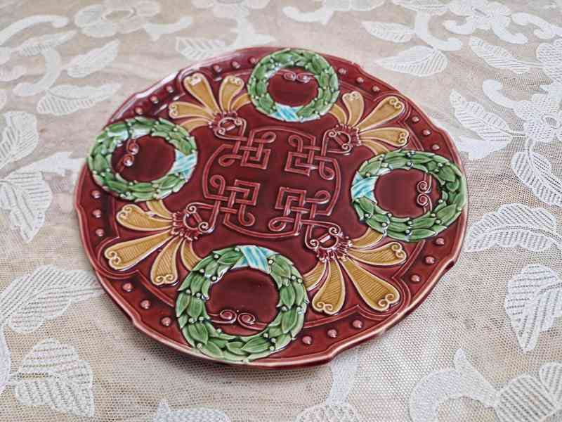 Krásný kameninový Talíř, majolika, plastický dekor, ruční malba - značeno Blansko, 19stol.