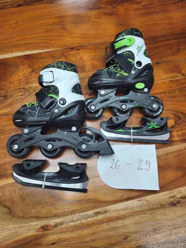 Tři páry kolečkových bruslí s nastavitelnou velikostí. Rozsah velikosti na fotkách u každého páru. Nejmenší pár bruslí lze kolečka vyměnit za ocelové břity na led. Všechny páry bruslí jsou maximálně jednou použité na zkušební jízdy. Na prodej každý pár zvláště. Při koupi všech naráz, cena 1.200,- za všechny tři páry.