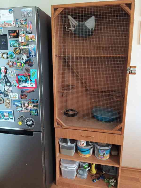 Prodám voliéru vhodná i do interiéru se šuplíkem a policemi. Š70/V191/H46. Díky univerzálnosti lze zadaptovat i pro ptáky, jiné hlodavce, plazy, ještěry, a jiné domácí mazlíčky. Lze doplnit částečně čirým plexisklem ve spodní části.