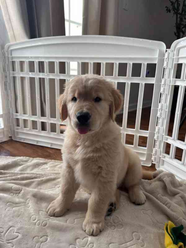Krásný zlatý retrívr hledá nový domov. Je to šťastný, zdravý a zábavný pes. Velmi přátelský a má dobrý vztah k dětem. Vyrůstal v rodinném domě s dětmi.